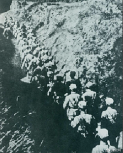 ▲1937年9月25日,八路軍第一一五師主力在晉東北取得平型關(guān)大捷,殲滅日軍1000余人,打破了日軍“不可戰(zhàn)勝”的神話。圖為向平型關(guān)挺進(jìn)的第一一五師。